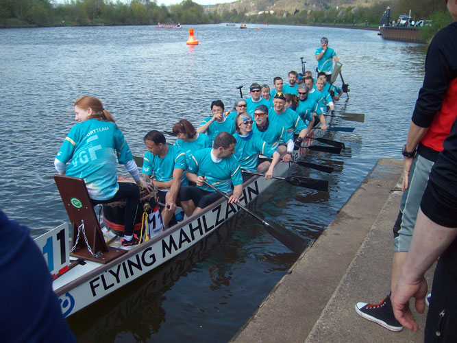 Nach dem Start wurden Rhythmus und gemeinsamer Druckpunkt bei der Wasserarbeit schnell gefunden. Die taktischen Absprachen passten optimal zusammen, Überholmanöver gelangen konzentriert und schnell. Durch kluges Taktieren des Steuermannes und die volle Einsatzbereitschaft des Teams fuhren die Schlammbeiser als Vierte über die Ziellinie, die VGF Dragons belegten einen ordentlichen sechsten Platz.