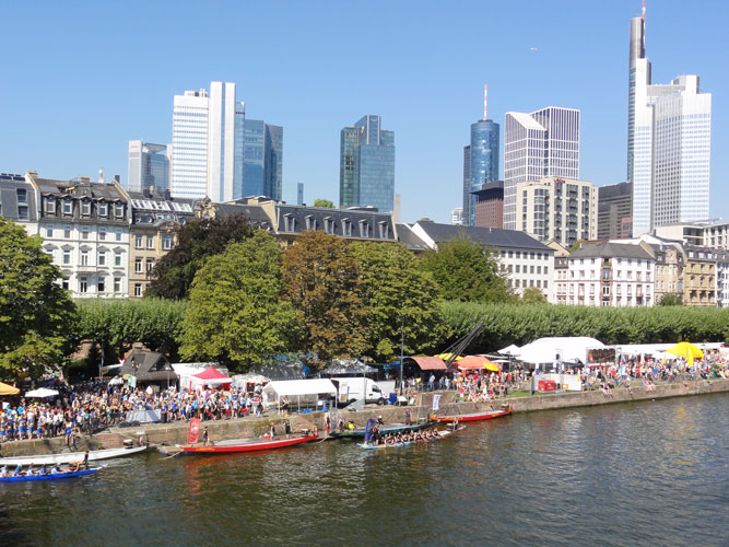 Wie auch im letzten Jahr wurde auf dem Main fliegend gestartet. Die Regattastrecke betrug ca. 430 Meter – von der Untermainbrücke zum Holbeinsteg. Sieger wurde, wer als erstes den Glocke im Ziel schlug. Dieses Mal gab es vor dem Finale einen Hoffnungslauf. Für das entscheidende letzte Rennen qualifizierten sich die je ersten beiden aus den Vorläufen und der Sieger des Hoffnungslaufes.